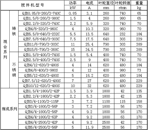 三、QJB潜水搅拌机的技术参数